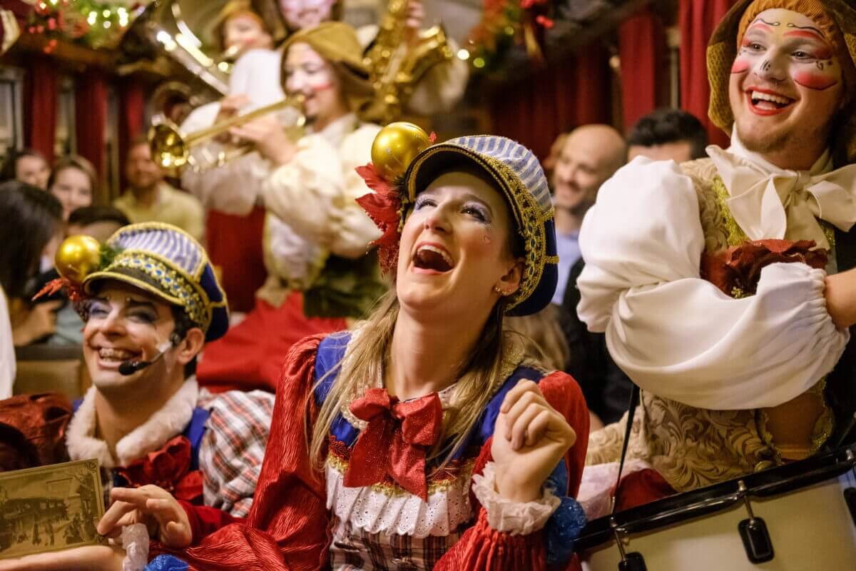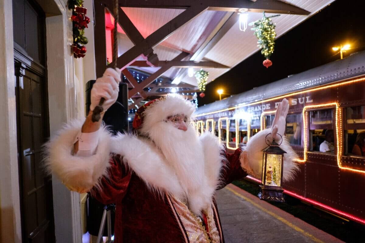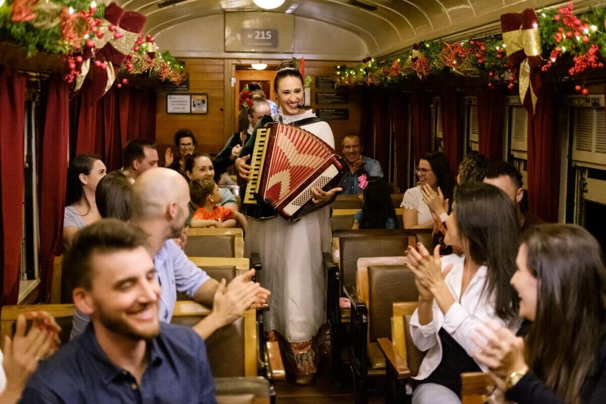 A experiência segue a bordo da Maria Fumaça – Trem do Vinho, com músicas natalinas e interação dos artistas. Durante o trajeto, os passageiros degustam vinhos, espumantes e sucos da região.
